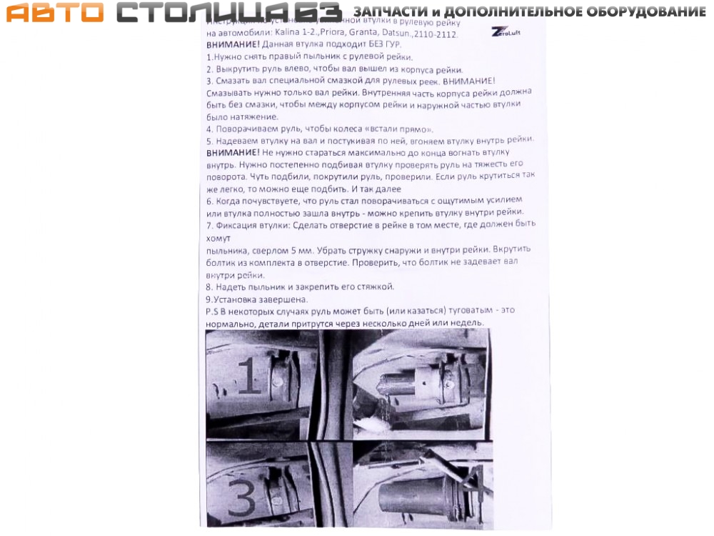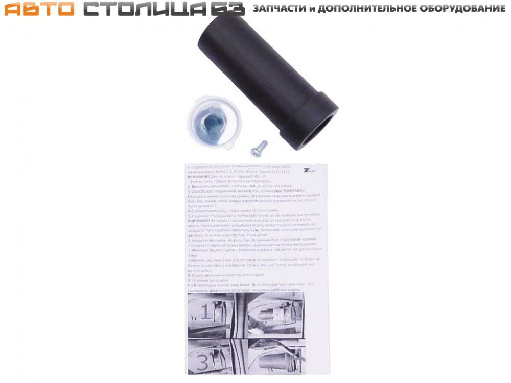 Комплект поставки включает: втулка рулевой рейки усиленная, смазка, фиксирующий винт, инструкция по установке.